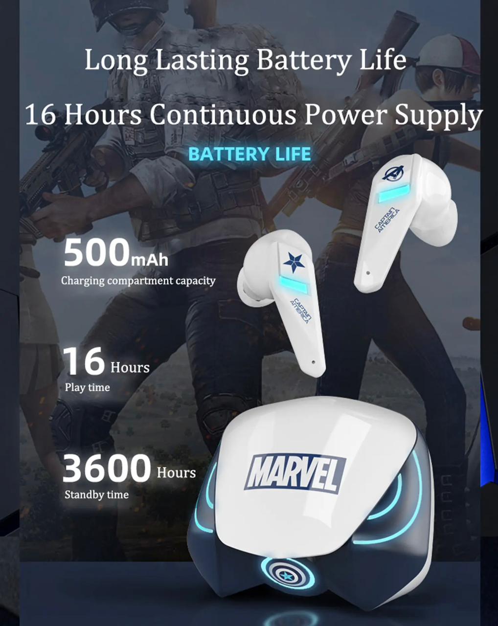 Introducing True Wireless Stereo earphones, the ultimate audio experience for Marvel fans. These officially licensed earphones utilize advanced Bluetooth technology for seamless wireless connectivity. With a built-in battery and LED display on the charging case, you can enjoy extended use. The superior design ensures clear audio and noise reduction. Get your own Marvel Avengers TWS earphones now at select retailers.